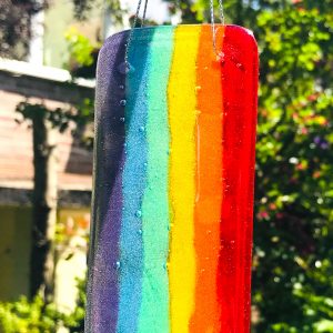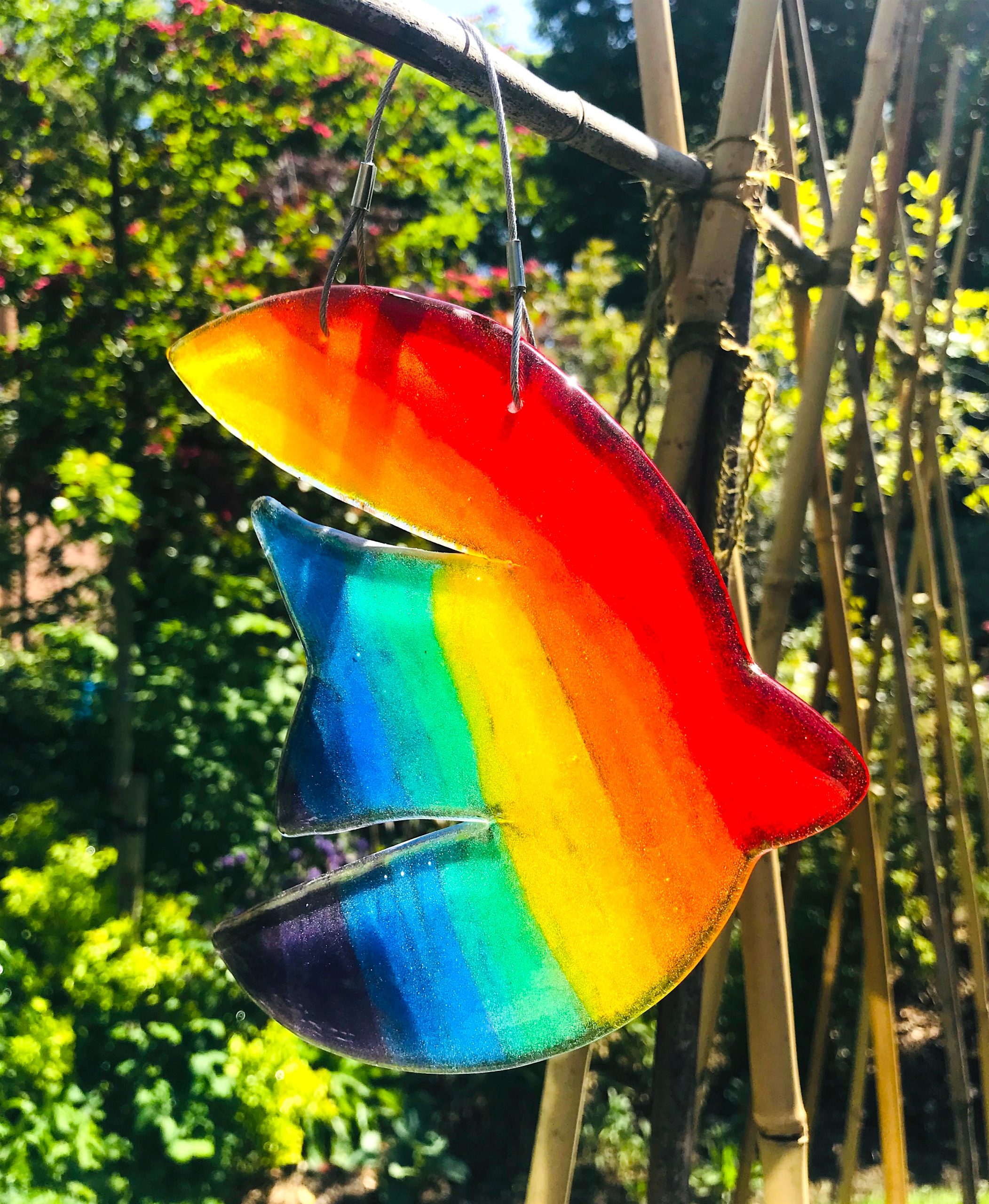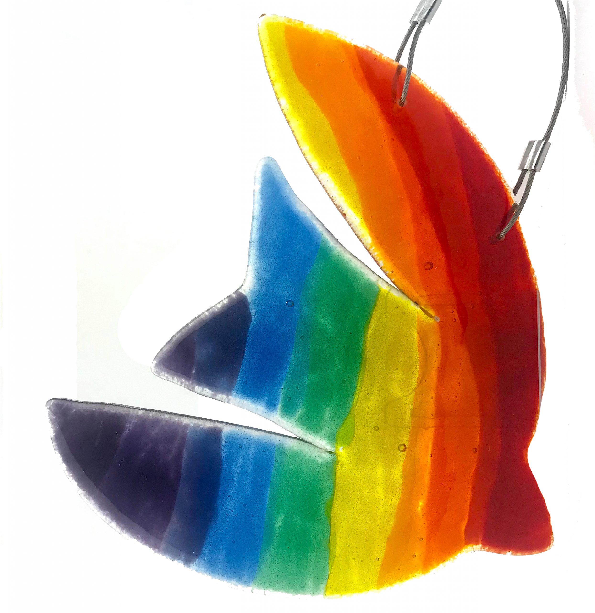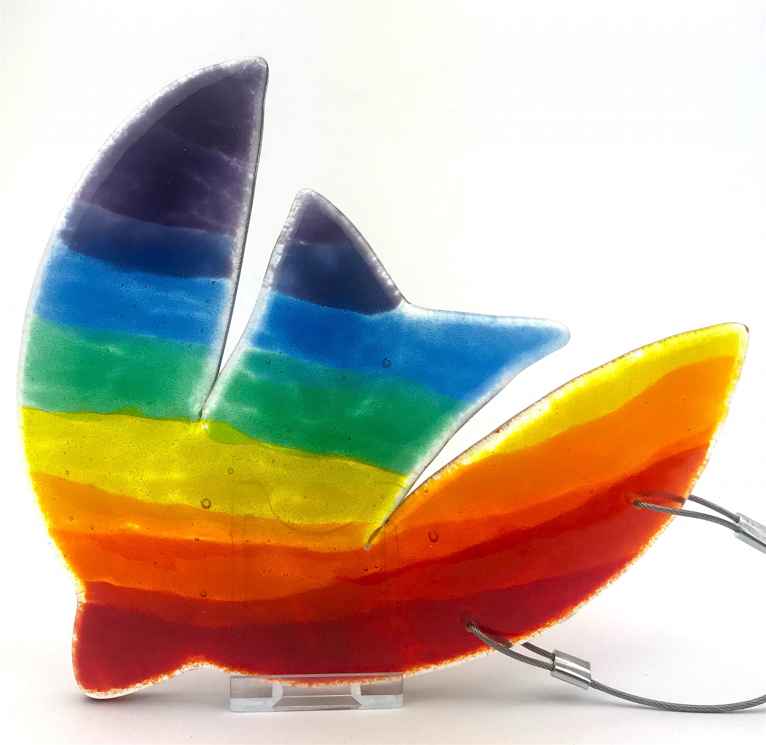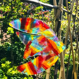 This lovely abstract rainbow bird can be displayed in your home or in your garden. It would look great in a porch or on a balcony. It is at it’s best when sun shines through it as it is made from transparent fused glass.